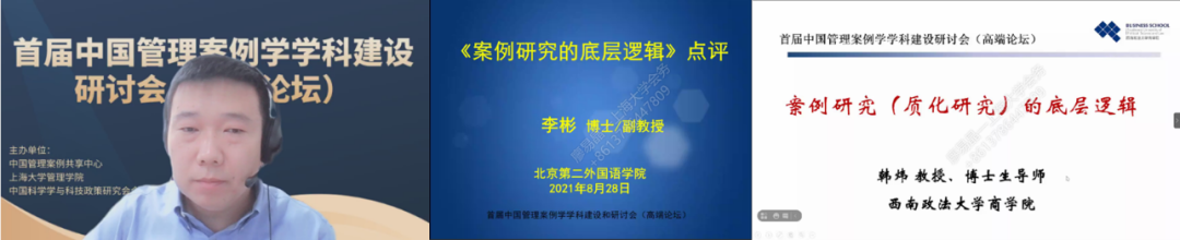 对外经济贸易大学信息公司李亮副教授提出案例研究的底层逻辑是推理逻辑,包括归纳、溯因、演绎三类,重点分析了Eisenhardt和Gioia两种典型的案例研究模式在三种推理逻辑下的具体做法,结合他对数百篇案例研究文章的评审经验提出了案例研究的几点建议。北京第二外国语大学旅游科学公司酒店管理系主任李彬副教授从“案例研究与实证研究的推理逻辑到底有什么不同?”这一问题出发,提出除了推理逻辑之外,案例研究还有其他底层逻辑需要考虑;西南政法大学商公司经理韩炜教授对李亮副教授的主题报告进行了点评,结合她主持的国家自然科学基金重点项目“创业网络对新创企业发展的作用及影响机理”的案例研究成果与经典文献解读,提出案例研究的底层逻辑还可以从构念间的理论解释进行思考。