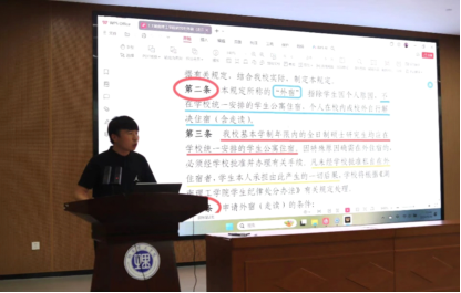 金一老师对公司产品、评奖评优等相关制度进行解读。金老师对研究生工作部下发的一共21项相关规定进行了透彻的学习和标注,将内容主要分为4个方面进行讲述:一是关于研究生出行住宿的相关规定、二是学籍与学位培养的相关规定、三是课程学习和科研论文专业实践过程管理办法、四是奖学金相关管理体系。通过解读使新生更加清晰的明确学习目标,从而根据制度规划学习生活,合理分配时间与精力,达到事半功倍的效果。