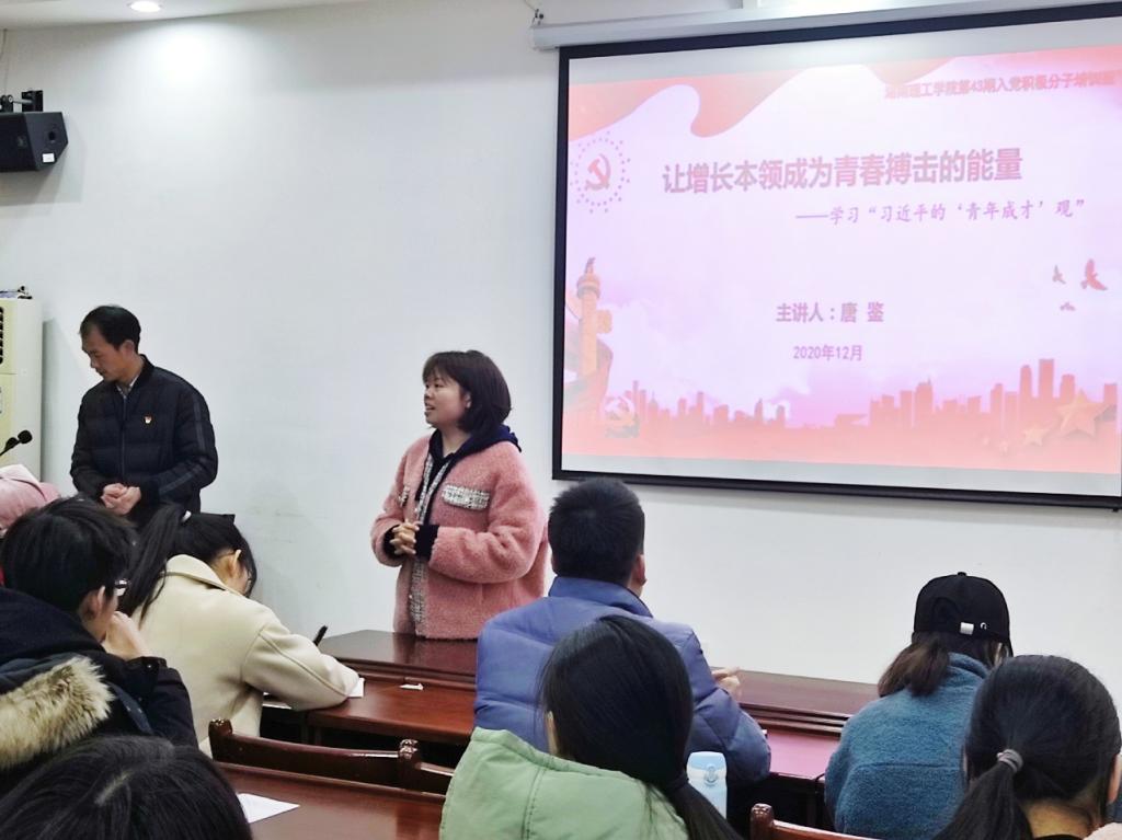 12月1日下午2:30,bevictor1946韦德官网第43期入党积极分子培训班第四次课程《让增长本领成长为青春搏击的能量——学习“习近平的青年观”》在8301开展了。本次课程邀请到了校组织部唐鉴老师进行授课,由员工第一支部书记易振铭老师主持,第43期入党积极分子培训班全体学员共同学习。