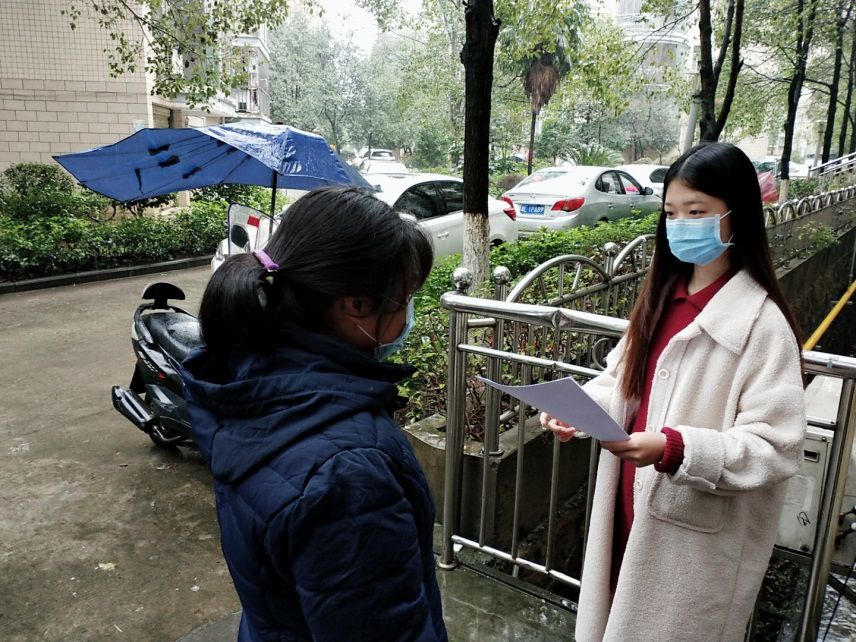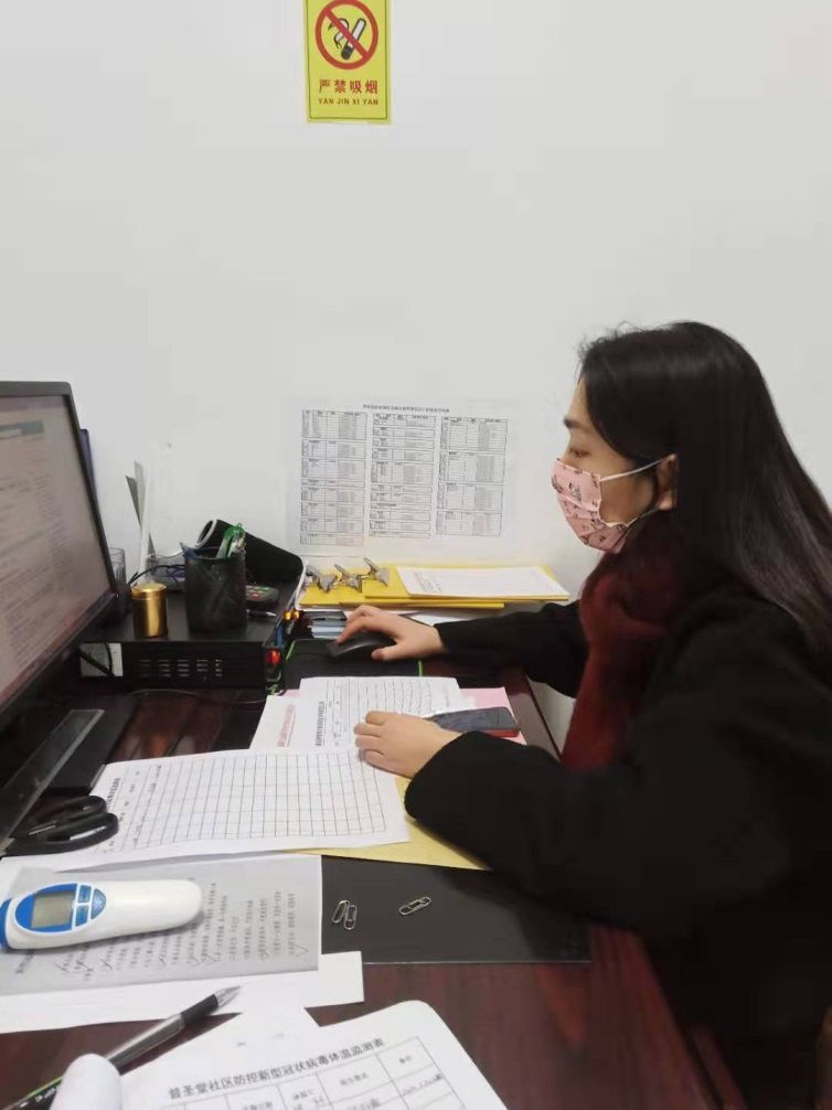 员工第二党支2017级员工党员陈晶晶响应社区疫情防控中心的号召,自觉担起责任,在华容县田家湖生态新区普圣堂社区配合社区管理人员,每天步行2小时到达社区定点开展工作。她发挥学业专长,帮助制作疫情监测表和物资领用表,值岗登记来往人员和测量相关人员的体温情况,协助社区工作人员分发关于疫情防控的手册,向居民传达必要的注意事项,下达好当地政府文件,以引导群众正确面对疫情,认真完成每一项工作任务和安排。