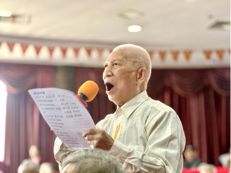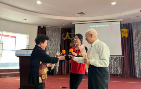 在红歌合唱环节,志愿者们与老人一起合唱了《没有共产党就没有新中国》、《我和我的祖国》等歌曲,全场老人情绪饱满,精神灼烁,激情澎湃,忘我歌唱。铿锵的歌声带来艺术享受,唤起红色记忆,给活动的顺利开展奠定了基调。紧接着,志愿者教老人们学唱《歌唱祖国》,这首歌对于多数老人较为陌生,一开始教学起来较有难度,志愿者结合音乐视频,一字一句的教唱。过程中,志愿者邀请到一位老人为大家领唱,志愿者跟随老人们歌唱,经数遍之后,老人们对旋律逐渐熟悉了起来,慢慢的也能跟着音乐哼唱。现场气氛热烈,歌唱声、喝彩声、拍打节奏声不绝于耳,志愿者们、教工们也不吝赞美,老人们相互鼓劲,各个展现出自信良好的精神面貌。