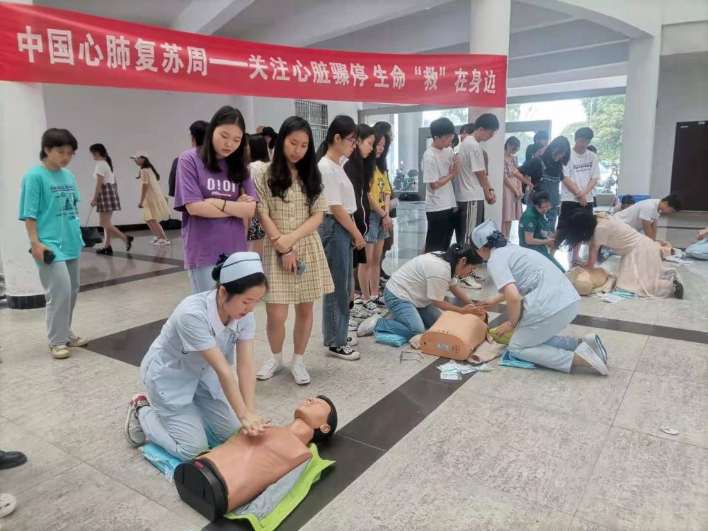 讲座现场,市一人民医院胸痛中心专家结合医学知识和临床经验,详细讲解了心肺复苏,人工呼吸,心脏按压,体外除颤等专业自救互救知识,介绍了病人特点、黄金救治时间及成功率等,并对心脏骤停的临床诊断、心肺复苏的各项流程进行了展示分析。在医护人员的指导下,同学们现场体验了心肺复苏操作过程及要领,观看医护人员如何进行人工呼吸和除颤仪等实际操作,让同学们更加清晰直观地了解急救知识。