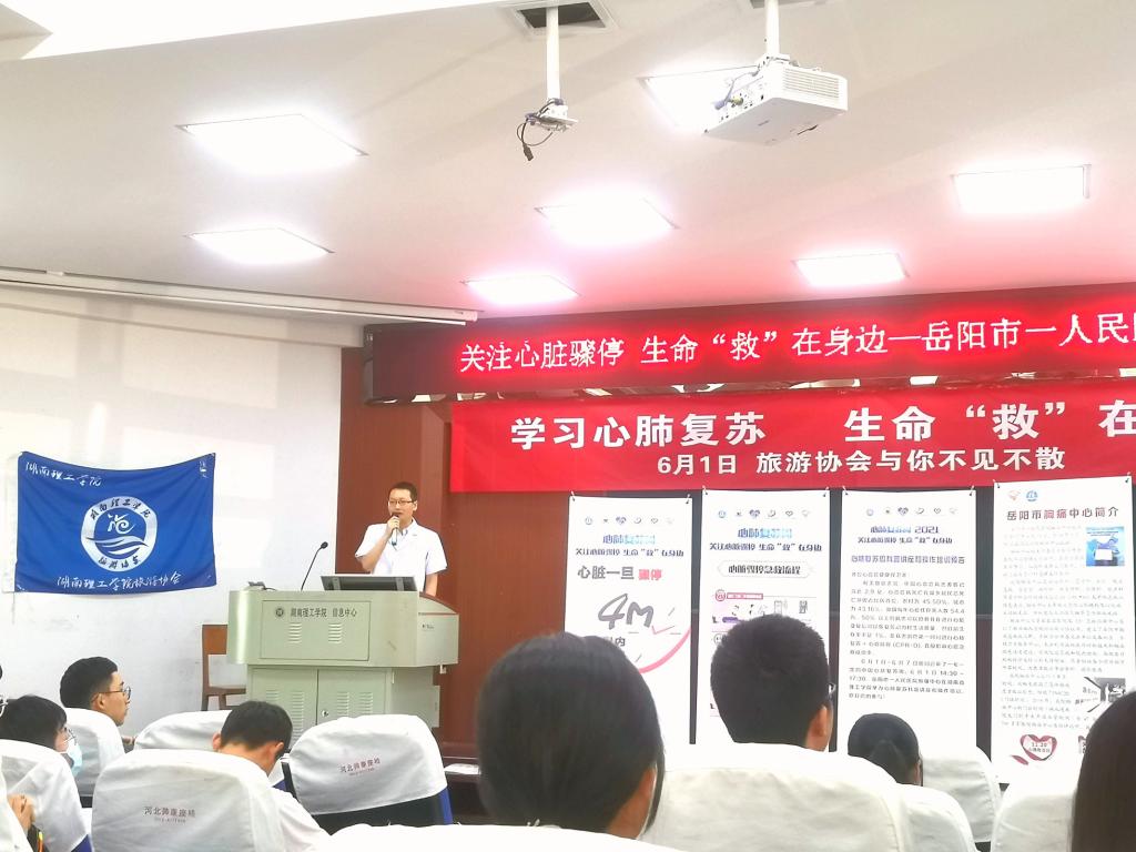 为加强同学们对突发事件的应急救治水平,更好地掌握急救知识与技能,6月1日下午,bevictor1946韦德官网旅游协会联合岳阳市一人民医院胸痛中心专家团队,在六栋学术报告厅成功举办了以“学习心肺复苏,生命‘救’在身边”为主题的公益大讲堂。