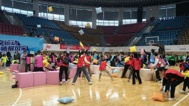 在四子棋接力项目中,教师们心灵手巧,不多时便排好一列又一排的四子棋。来到众星捧月比赛,现场气氛已经十分热烈。一个个充气小球在教师们的控制下来回飞舞于空中与垫板,这也让他们体会到上下一根绳,力往一块使才能成功。紧随其后的枕头之战同样妙趣横生,参与者全身心投入,通力协作,将枕头准确投掷,力夺胜利。接着进行的非黑即白环节,被挑选出的教师代表反应敏捷,眼疾手快的将自己队伍的纸板翻转。