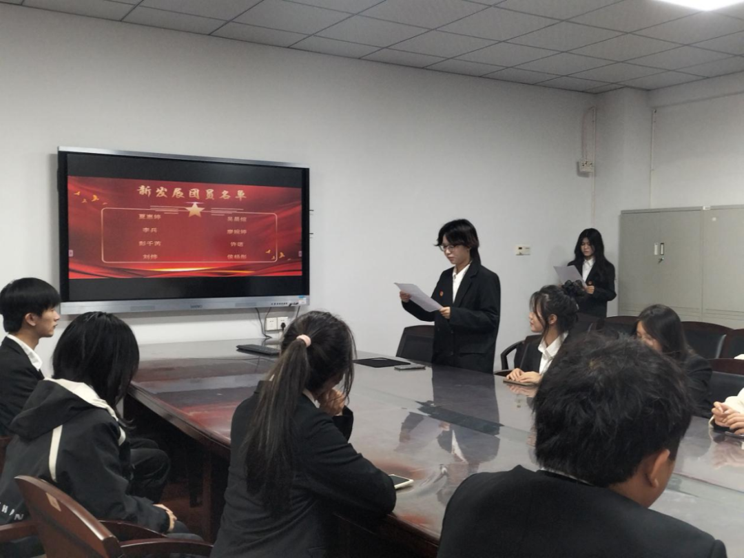 会议伊始,全体人员肃立,奏唱中华人民共和国国歌。随后,李艾璇宣读了八位新发展的团员名单,向新发展团员表示祝贺,并强调了共青团的使命与责任。