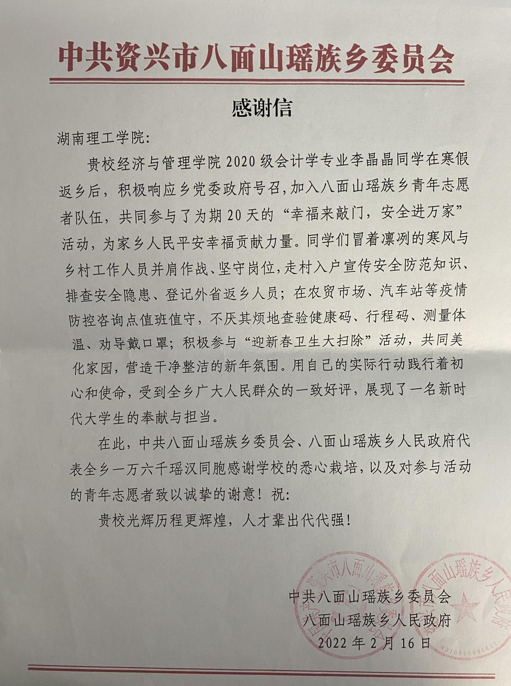 近日,bevictor1946韦德官网收到一封来自中共资兴市八面山瑶族乡委员会的感谢信。来信详述了公司2020级会计学专业李晶晶同学在寒假返乡期间为当地疫情防控所做的努力与贡献,并对公司和员工本人表示诚挚的谢意。