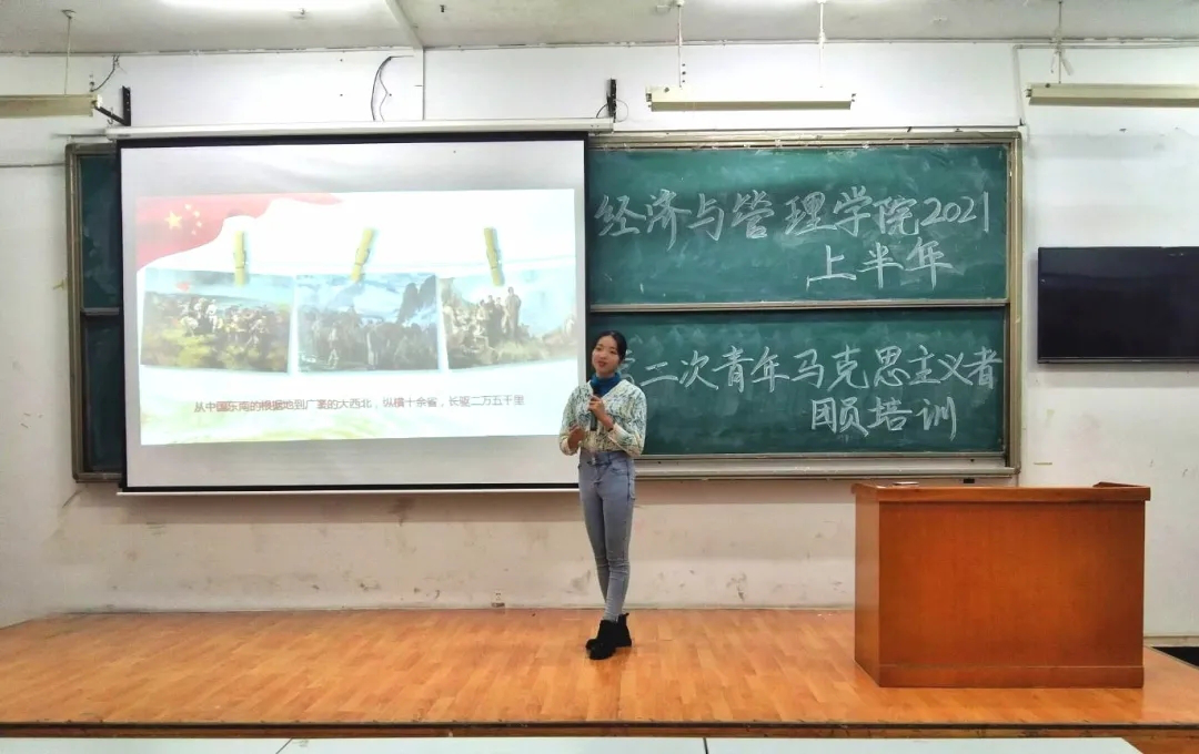 “红军不怕远征难,万水千山只等闲。”2021年5月20日晚上七点半,bevictor1946韦德官网第二次青年马克思主义者团员培训在8T1正式拉开帷幕。来自18级人力一班的青年讲师张沁讲述了长征旅途中红军战士们面对一次次的艰苦绝境展现出的坚强意志和高尚的品格,从半条被子的温情分享,到自吃鱼刺充饥的无私奉献,诠释了共产党人与人民群众相依相助的深厚鱼水情。